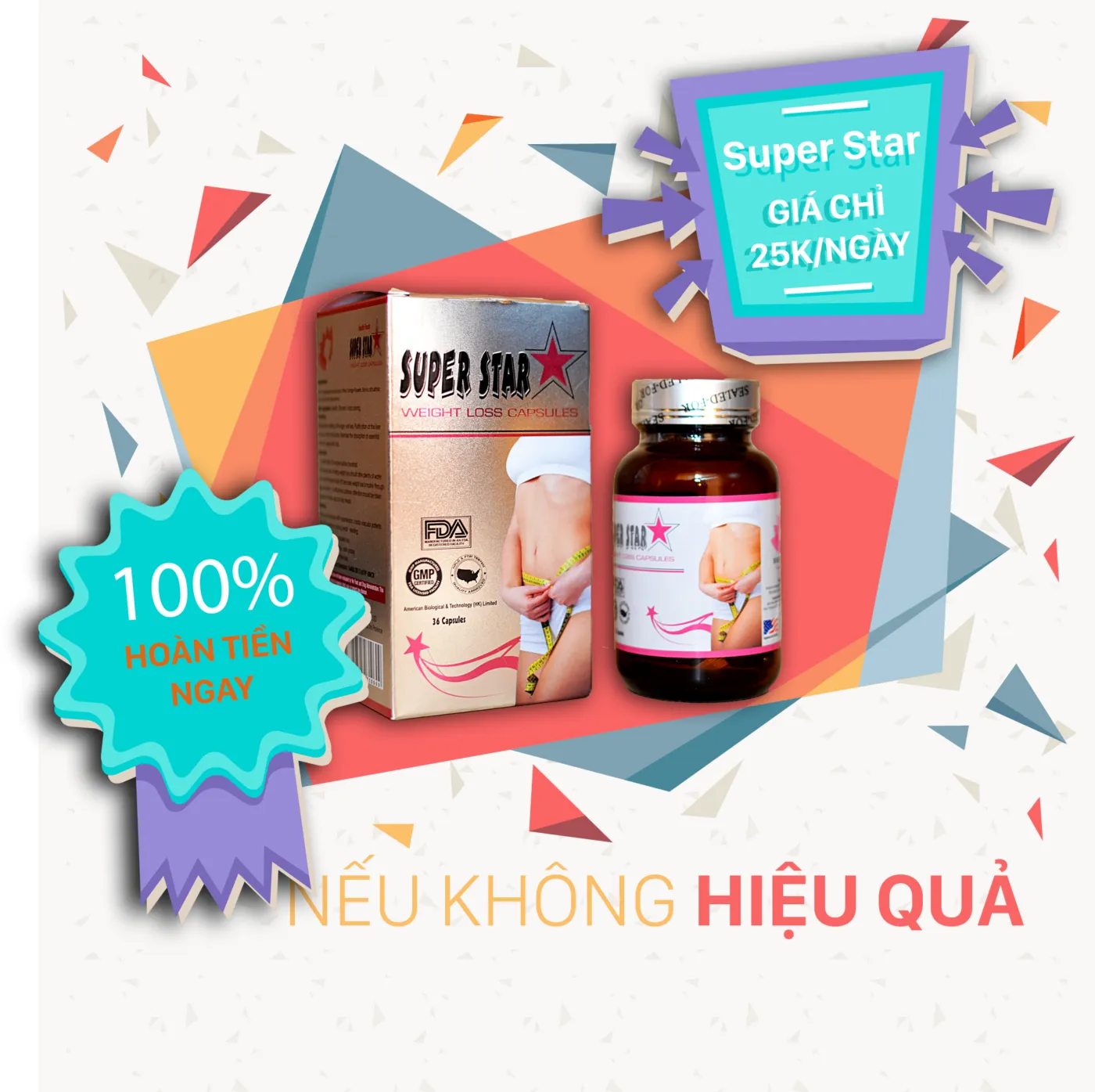 Viên uống giảm cân Superstar ( Super star weight loss capsules ) công thức kết hợp giữa thảo dược phương Đông và công nghệ hiện đại của Mỹ theo tiêu chuẩn FDA giúp đánh bay mỡ thừa hiệu quả. Hiệu quả sử dụng tùy theo từng cơ địa của mỗi người.